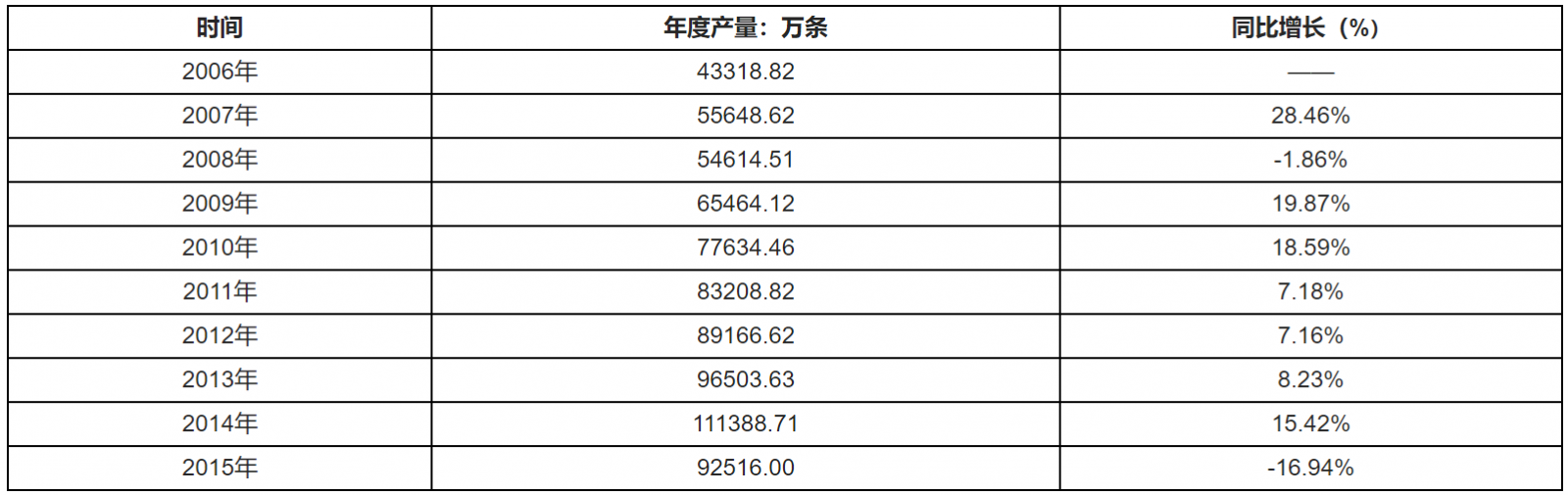 2006-2015年中国橡胶轮胎外胎产量及增长率统计表